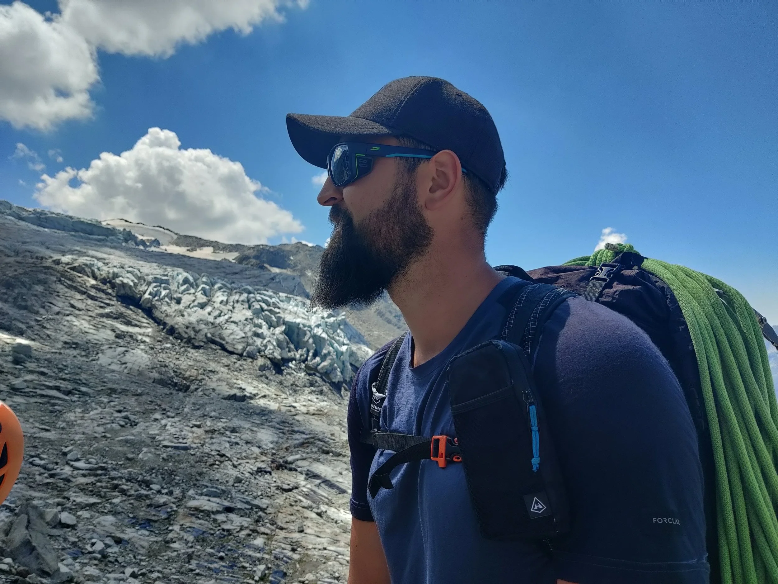 Out on the glacier we put on crampons to practise how to use them. Kim was again struggling so hard to walk in them and not fall over, but still managed to do that once. Lukas was just naturally good. We walked a bit on the glacier until we reached a part that was a bit steeper. Here we got to practise how to properly walk uphill and downhill on the ice with crampons on. After a while, the ice axe was added as well. Again, Kim was struggling while Lukas was doing great, and somewhere here Kim twisted her ankle and every step from there was quite painful. Kim often twists her ankles, but this was a bit worse than the other times and she could feel it straight away. We were soon done though, and walked up to the hut where we got our rooms, and later we met up for a fika. We were all rather hungry and couldn’t wait until dinner with eating. During fika we talked more about glaciers, rope teams and just general safety out on the glacier and in the mountains. Meanwhile, Kim kept worrying about her foot and how she will be able to use it tomorrow. We then had some rest before the dinner. Kim tried to rest her foot as much as possible at the room and tried not to be bitter and sad about the whole thing. Why did this have to happen when we just started? A while later we had dinner together, a “three course meal”. We didn’t complain as we were all quite hungry, you get what you get in the mountains. We got a very transparent soup as first meal, as second meal we got chicken with some vegetables in a soup together with couscous and then a dry cake as third meal.