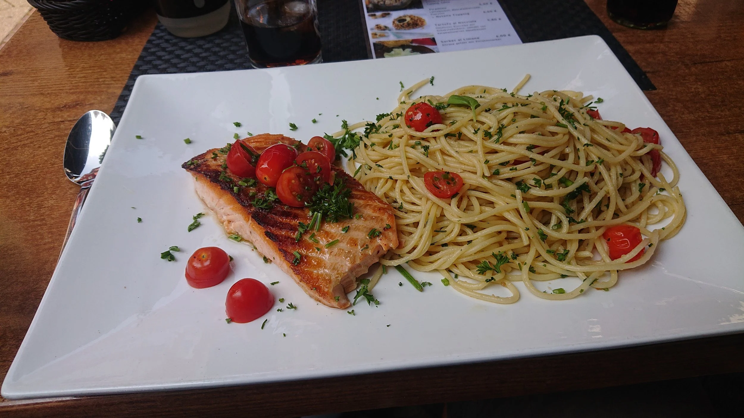 Then we drove to Offenburg where we parked and walked to a laundromat to do our washing. Worked really well! We waited for a little while, then at 11:30 we went over to a super nice restaurant, Guglhupf Offenburg, just 1-2 minutes away, literally around the corner, where we had some pasta for lunch.