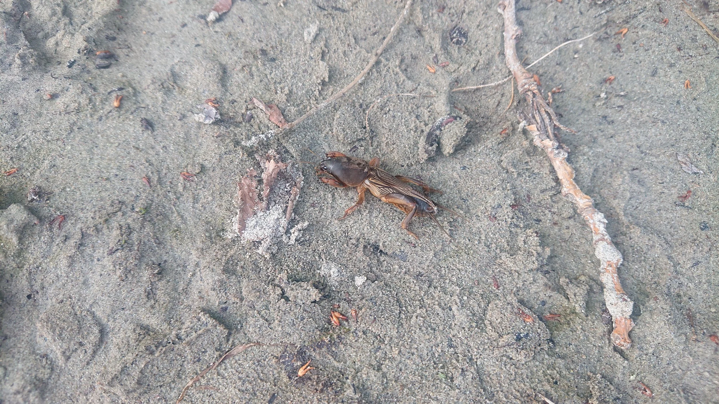 We then went over to the kiosk to have some food. Lukas and I had pizza and some Coca-Cola and mezzo-mix. After that we also ate some cheese cake and apple crumble which were okay, but the pizza was definitely better. We then went back to our spot at the other side of the lake to fetch our stuff, and saw the strangest thing crawling around on the beach. We've never seen something like it, and neither had the other ones around us. Looked like mix between a grasshopper and something else, like a frankenstein insect, and it moved really weirdly and quite quickly too. It looked like it had wings but it didn't seem to use them.