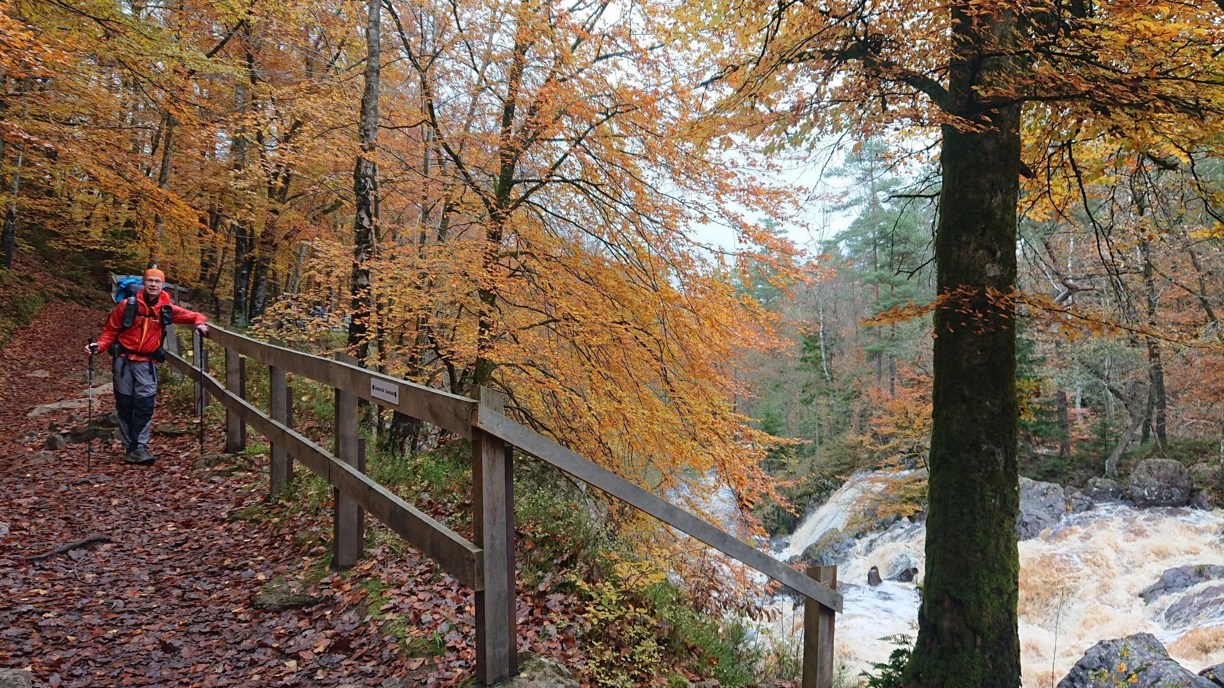 We got going, and followed Hallandsleden for a while. We caught up to a huge group of people, all stopping by "Danska fall". I tried to take a photo of the big tourist group, but I just got a photo of Peter instead 😉