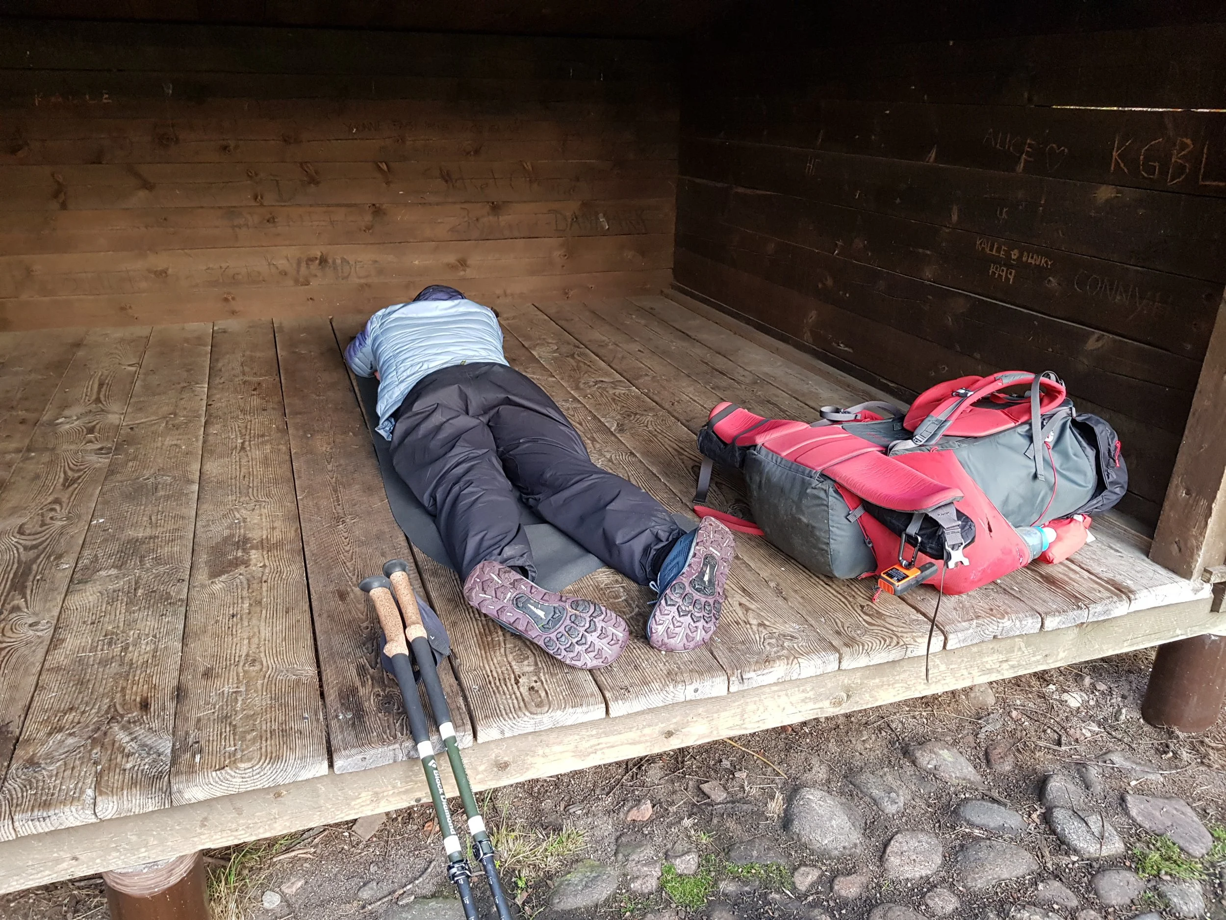 We then walked on and on, talking about all sorts of things, while my feet started protesting more and more loudly as we went on. After passing Eketsbygget we took a break to sit down, and then I pushed on the last bit, trying to ignore my tired feet. After what felt like an eternity we reached Smedjeån. Here we filled water to filter later, and not long after, we reached the shelter, where I just lay down to breathe for a few seconds. Again, we arrived before sunset, so we could pack up all our things and have dinner in the last rays of the day.