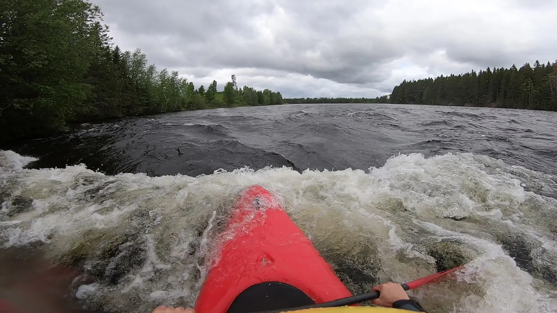 The last day we would practise some surfing, and it was a lot of fun when you finally made it, but really hard so lots of swimming for all of us. After all the practising of surfing for some hours it was finally time for a lunch break. After this waited a class 3 rapid that once again made us really nervous. When we scouted ahead and looked at “The Vice and Jocke’s Lock” (skruvstädet och Jockes lås) as the two places were called were you could get stuck with the kayak and be stuck forever. This rapid was quickly picking up speed and high valsar. We tried to aim for the first vals called Jocke’s Lock and we only had one chance to go through without capsizing. Luckily everyone made it through, and then we just had to aim for the next vals called The Vice and also this one went better than expected. But after The Vice I lost focus and capsized. It was way too shallow to get out of the kayak though, so I pressed both of my hands and my paddle down into the ground and scraped my hands on the rocks. It was worth it though because I made it up and continued to paddle. My hands hurt really bad, but I just had to keep my focus of getting as fast as possible to where we would end today.